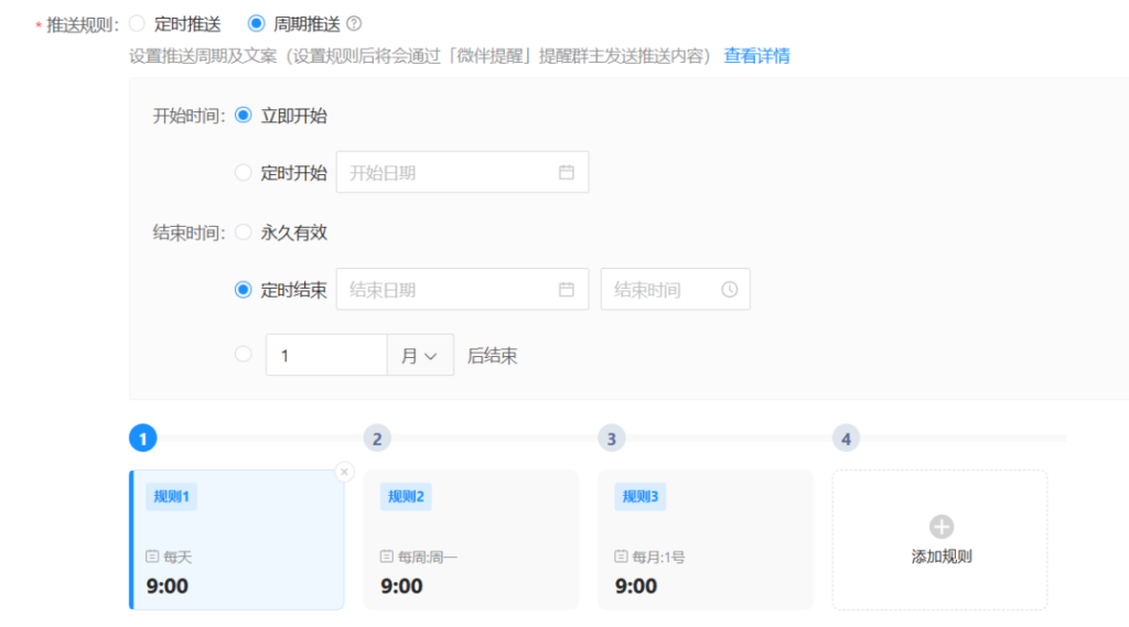 该功能支持 “定时推送” 和 “周期推送” 两种模式。管理员在后台设置规则时,可指定开始时间、结束时间(如 “永久有效” 或 “定时结束”),并自定义推送频率。