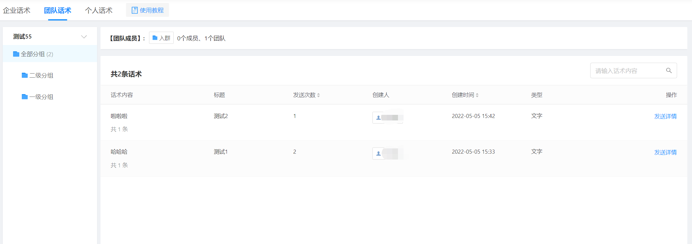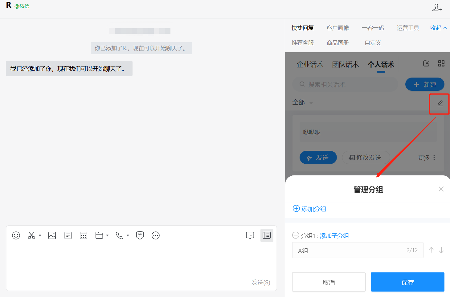 设置话术分组、添加相应话术,创建成功后,方便员工自己和客户沟通时使用。