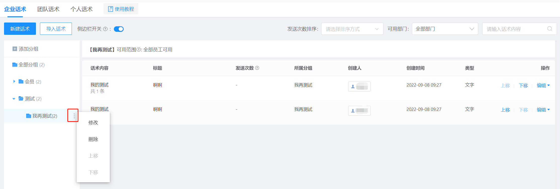 企业员工(微伴普通员工)可以直接在企业微信侧边栏创建个人话术;